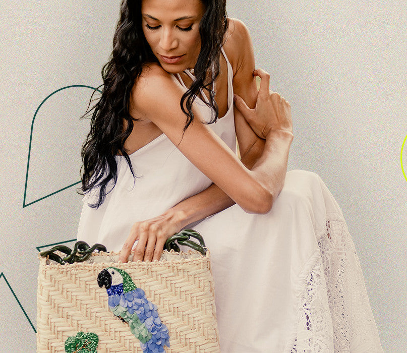 Bolsa artesanal Parrot Paradise – Fibra de palha natural com lantejoulas enfeitadas e alça de resina